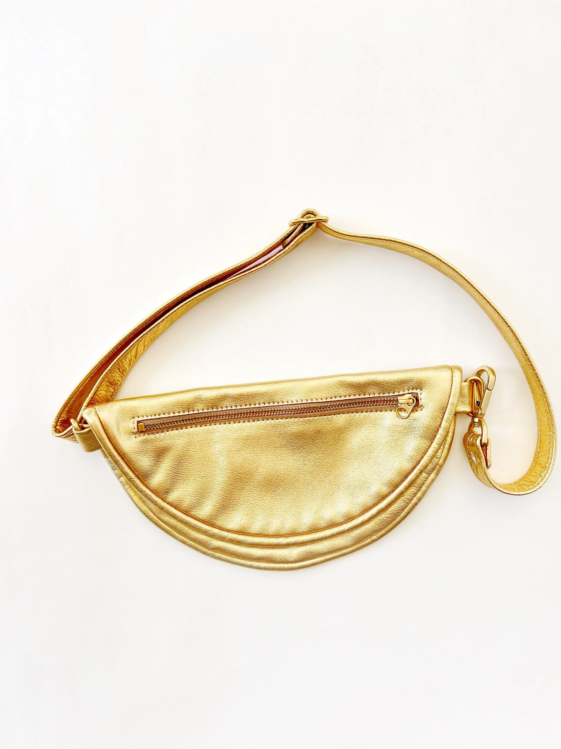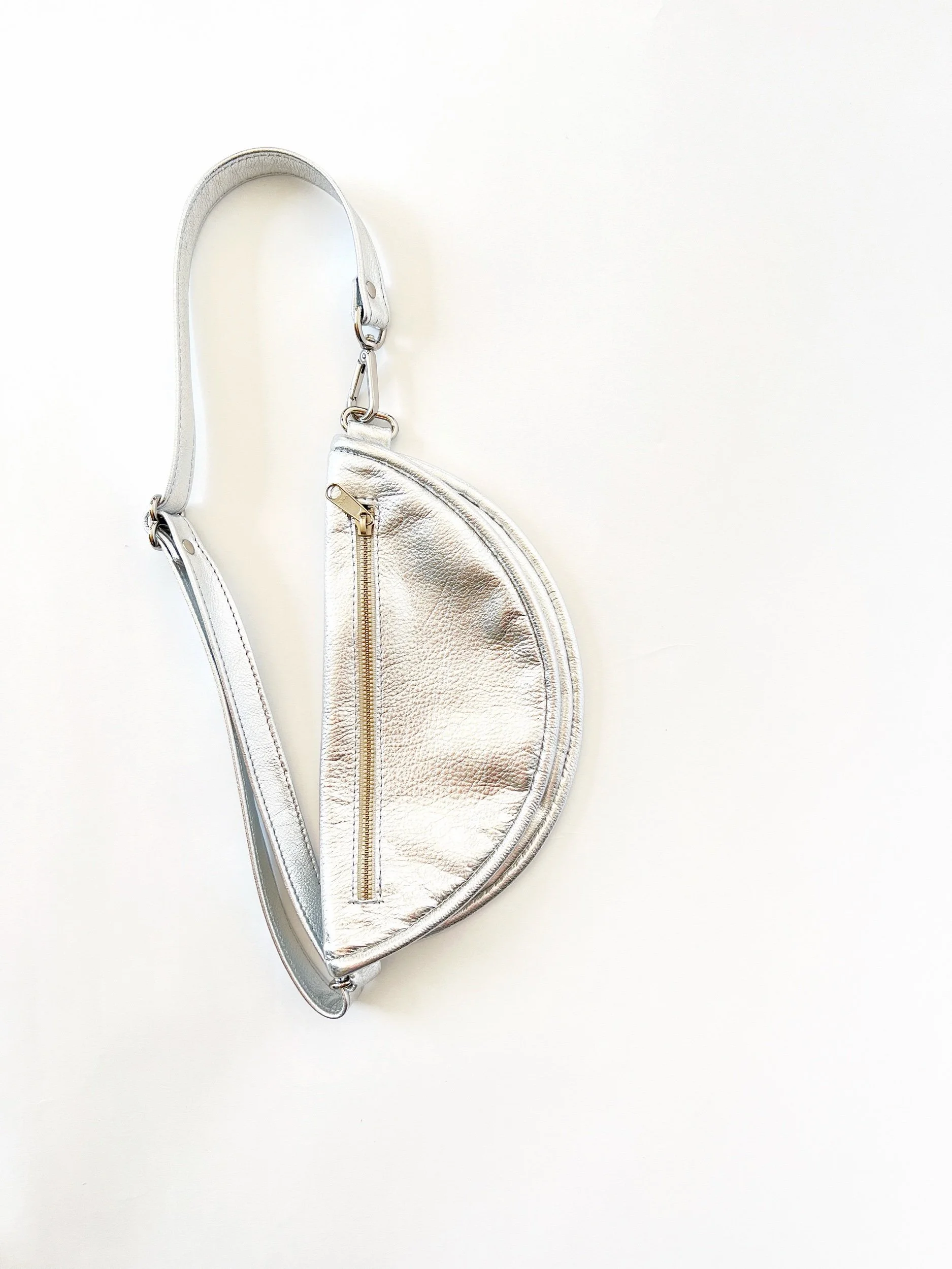 The Sling bag is a full circle that folds in half to create two interior compartments. A fully adjustable strap connects with a swivel clasp, and allows a variety of wearing options. Keep it on your back and hands free while you’re on the move. Slide it around to quickly grab your phone and essentials. The leather piping keeps the bag in shape across your body.
